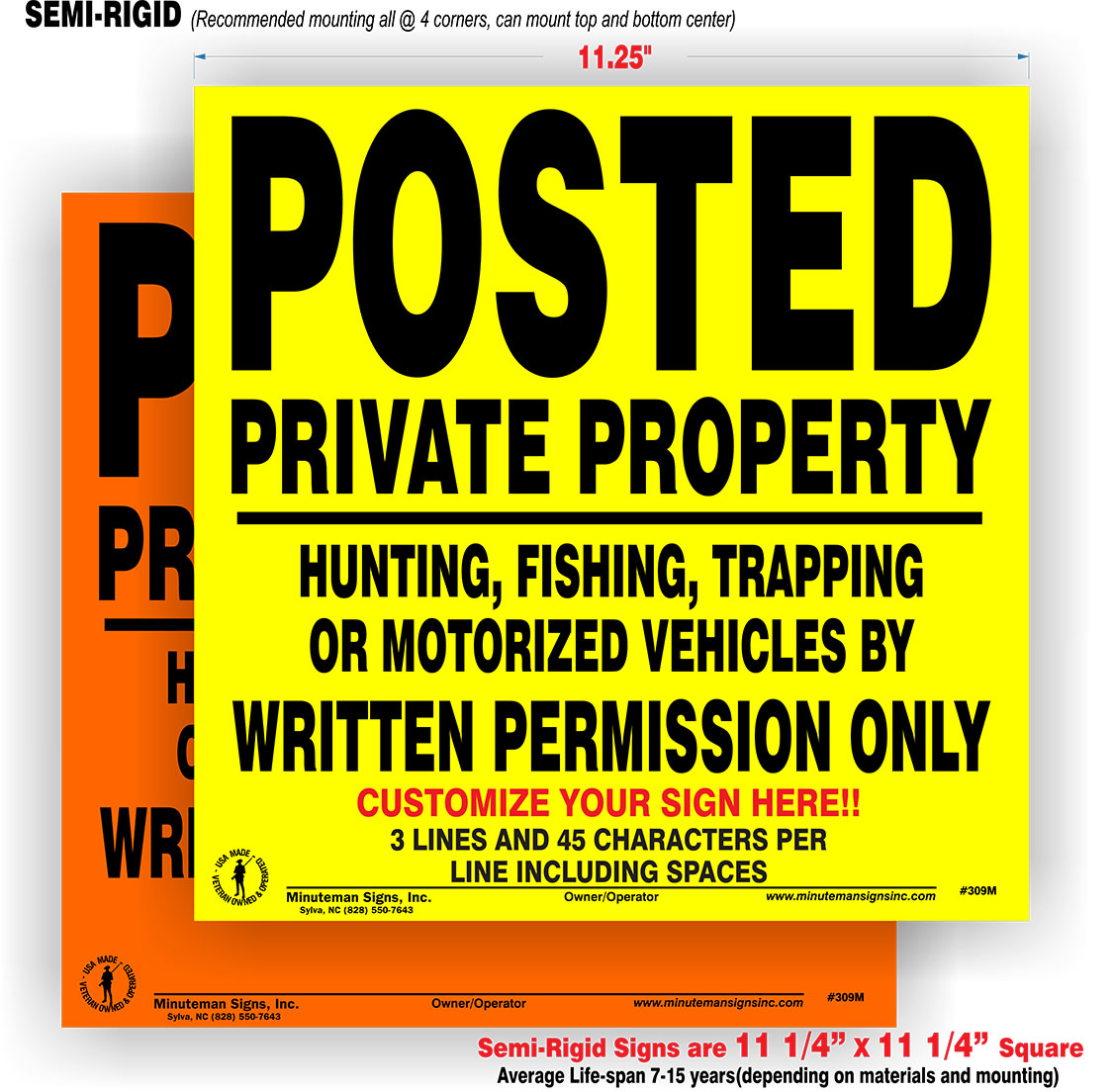 - These posted signs are .012 gauge and are 11.25″ x 11.25″ in size.